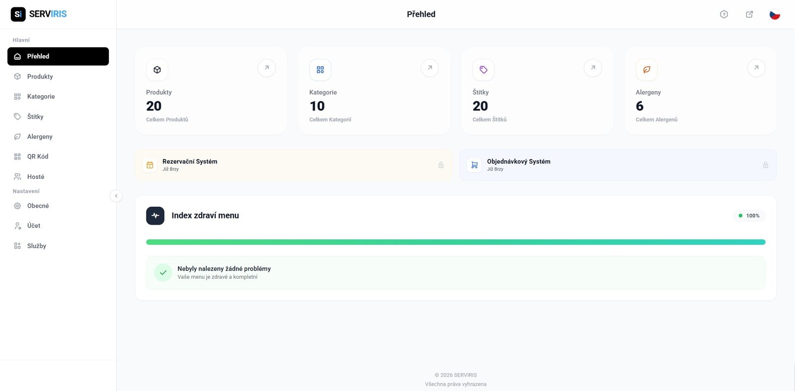 Spravujte produkty, kategorie, štítky, alergeny a ceny na jednom místě. Změny v reálném čase.