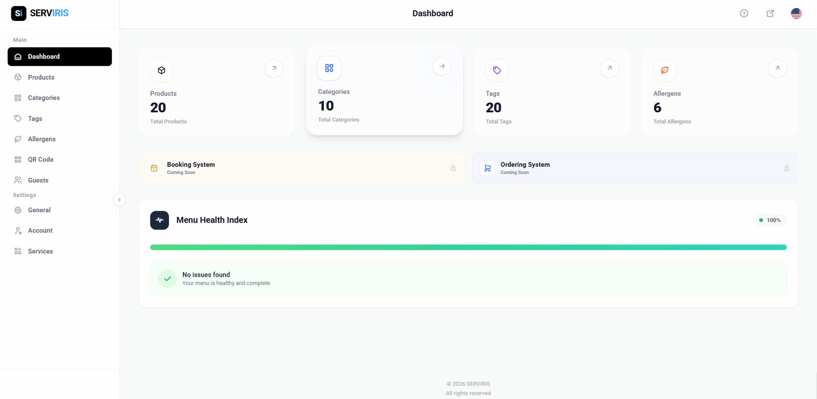Create QR menus in minutes. Manage allergens, translations & pricing, all in one dashboard.