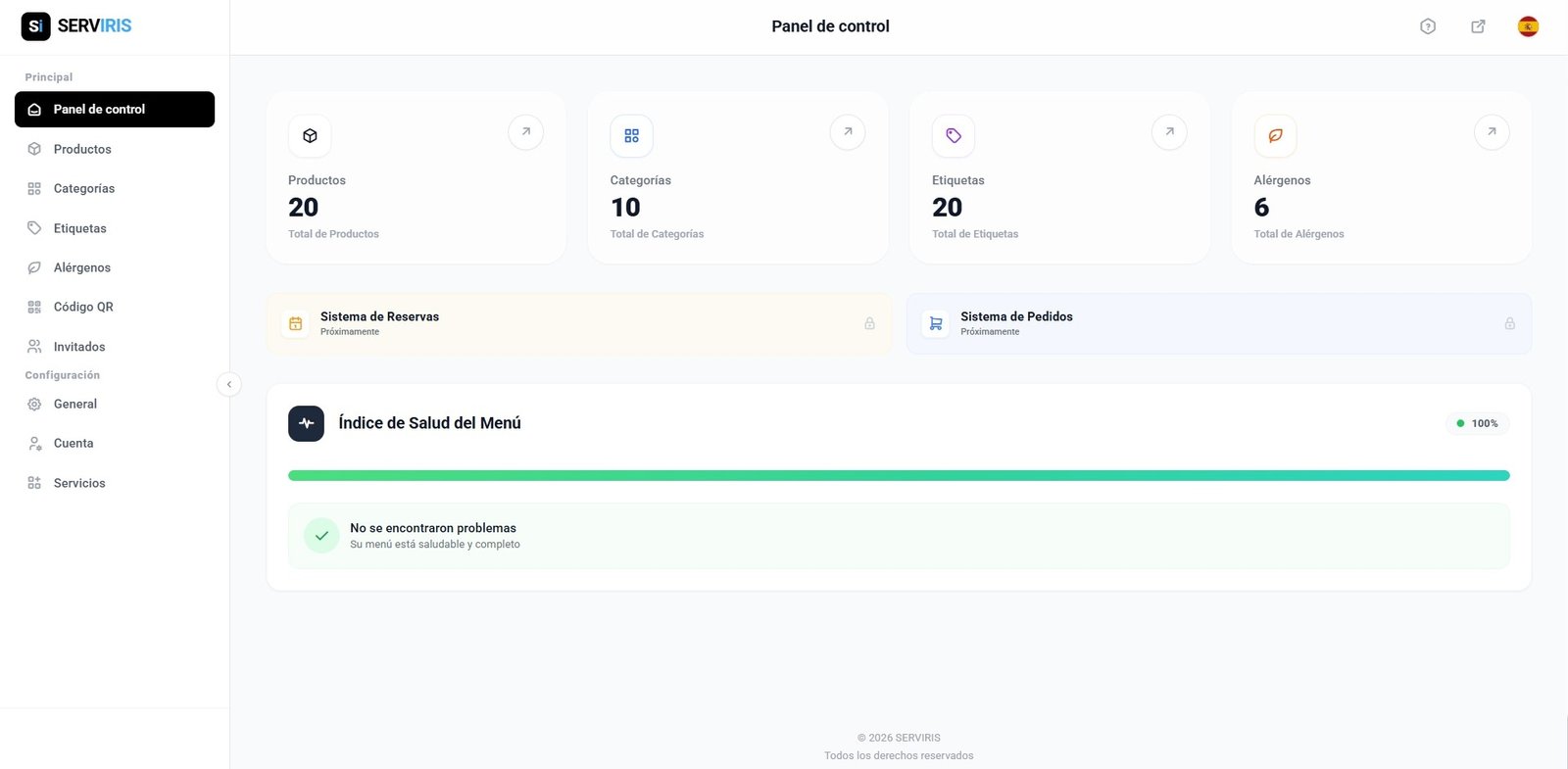 Gestiona productos, categorías, etiquetas, alérgenos y precios desde un solo lugar. Cambios en tiempo real.