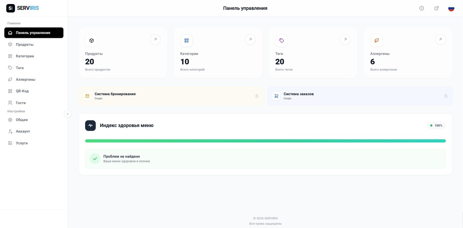 Управляйте продуктами, категориями, тегами, аллергенами и ценами из одного места. Изменения в реальном времени.