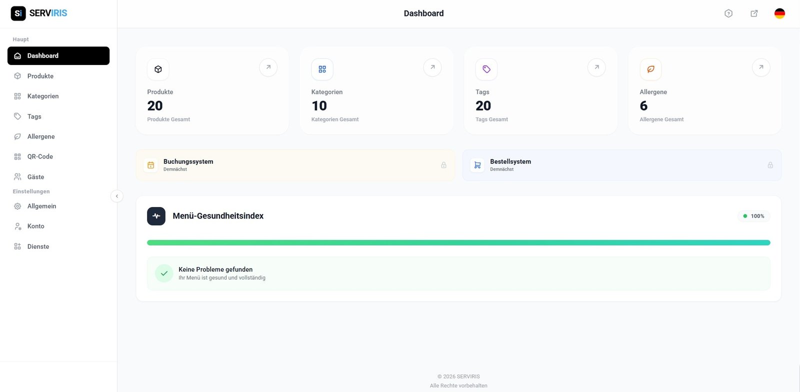 Produkte, Kategorien, Tags, Allergene und Preise an einem Ort verwalten. Änderungen in Echtzeit.